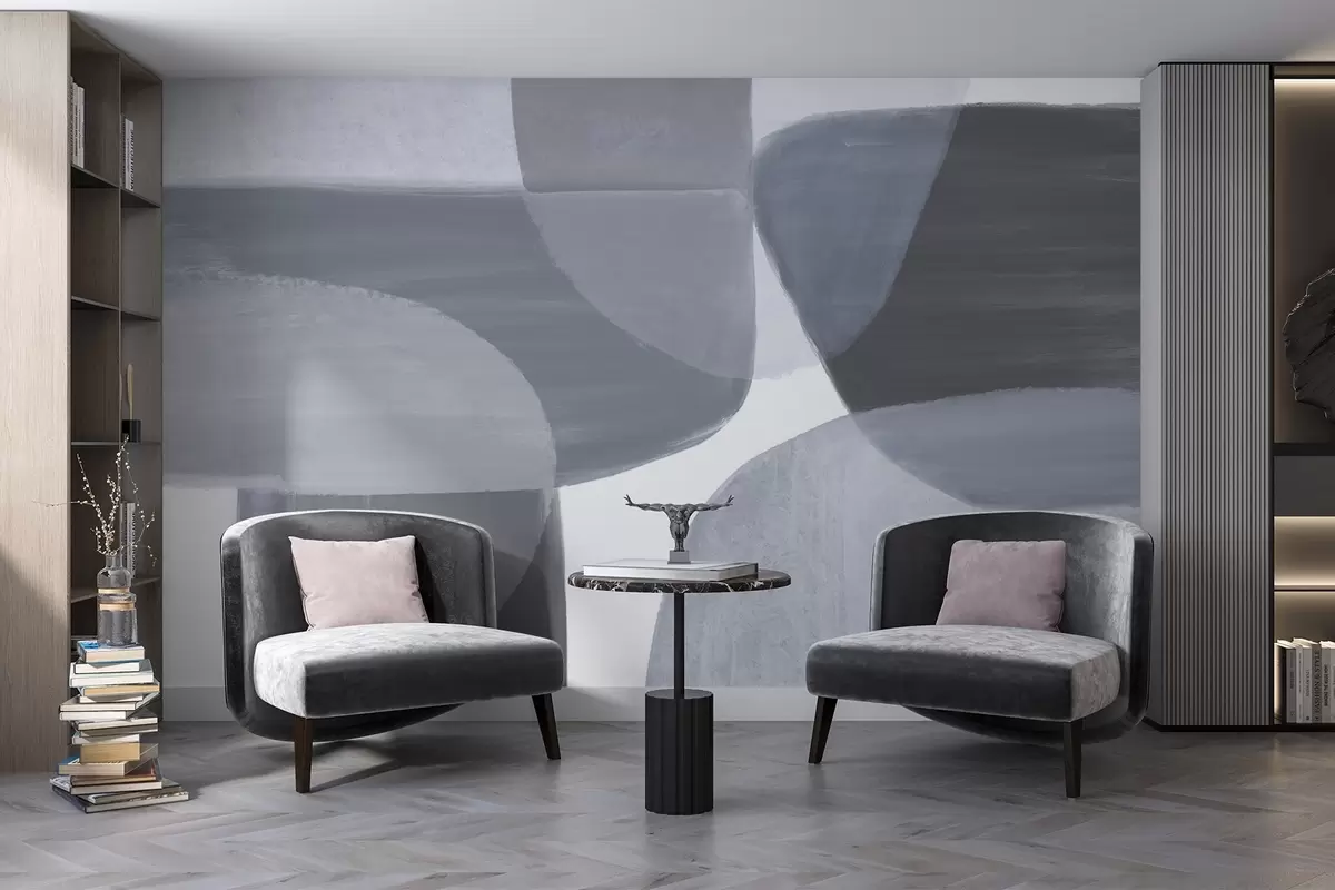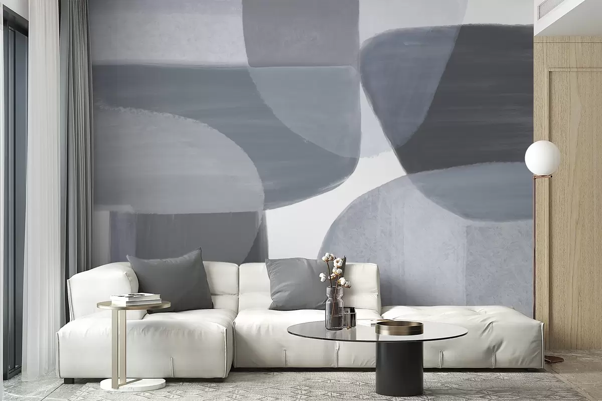 Fototapetak Monokróm absztrakt nyomat, egymást átfedő minimalista formákkal és alakzatokkal a szürke és a kék árnyalataiban Nr. w08410