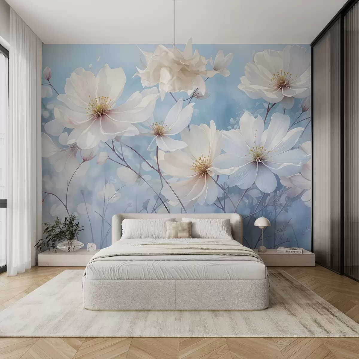 Fototapetak Finom fehér virágok puha szirmokkal, elmosódott kék háttér előtt, nyugodt és éteri hangulatot teremtve Nr. w08412