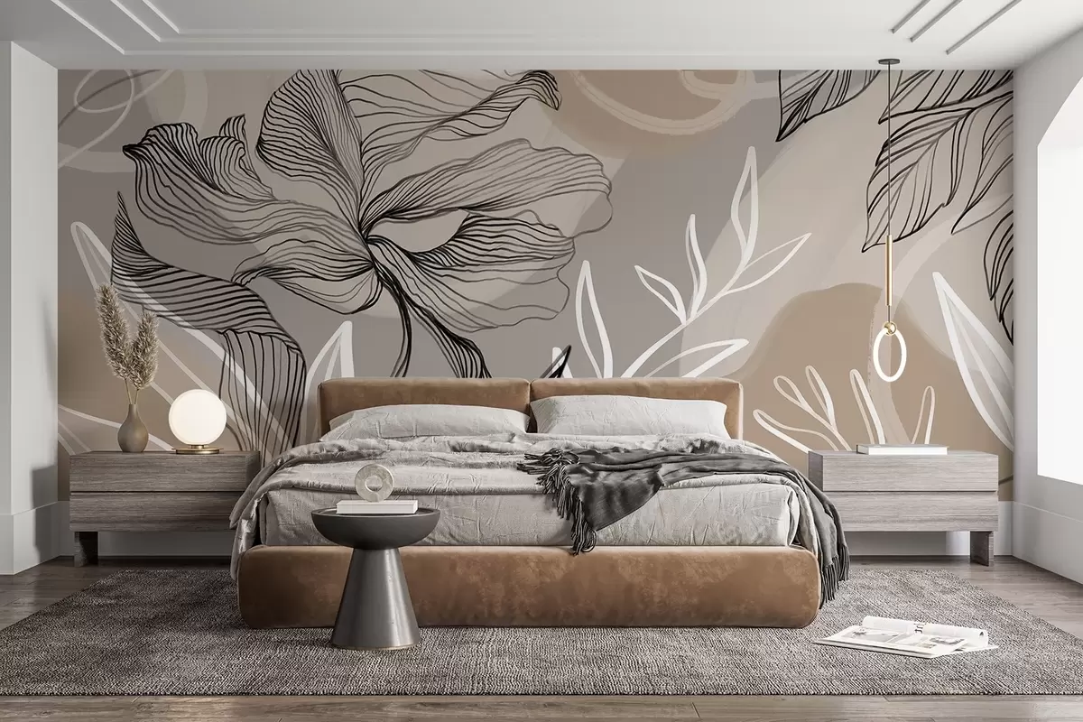 Fototapetak Elegáns virágos nyomtatás nagy absztrakt vonalú virágokkal és levelekkel, szürke és bézs árnyalatokban, világos háttérrel Nr. w08413