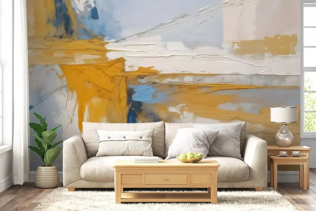 Fototapetak Minimalista absztrakt művészeti kompozíció merész ecsetvonásokkal sárga, kék és fehér festékkel Nr. w08414