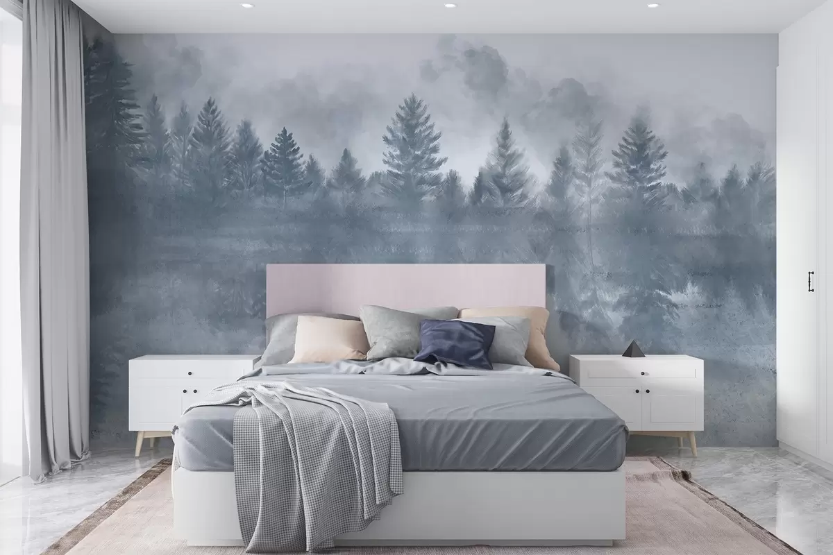 Fototapetak Nyugodt táj, sűrű fenyőerdővel körülvett befagyott tóval, ködös, ködös légkörrel Nr. w08415