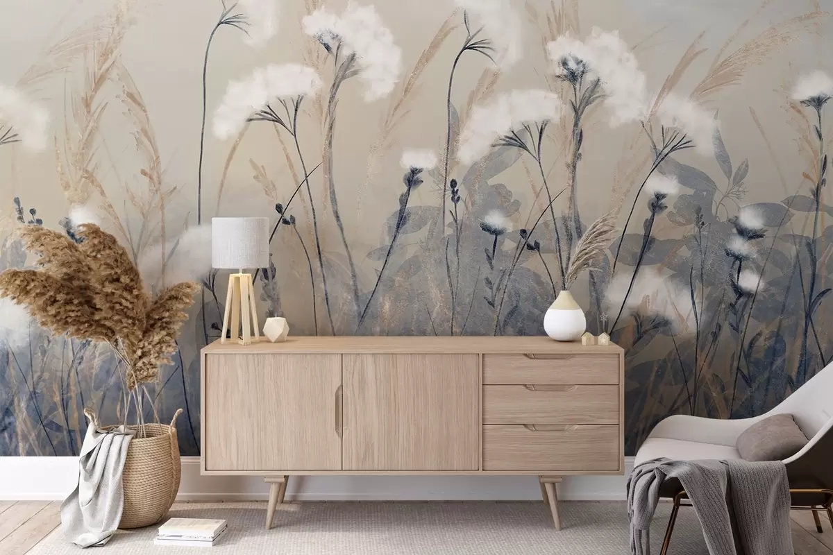 Fototapetak Bolyhos, fehér pamutfű elmosódott texturális háttér előtt, lágy, ködös és derűs hangulatban Nr. w08416