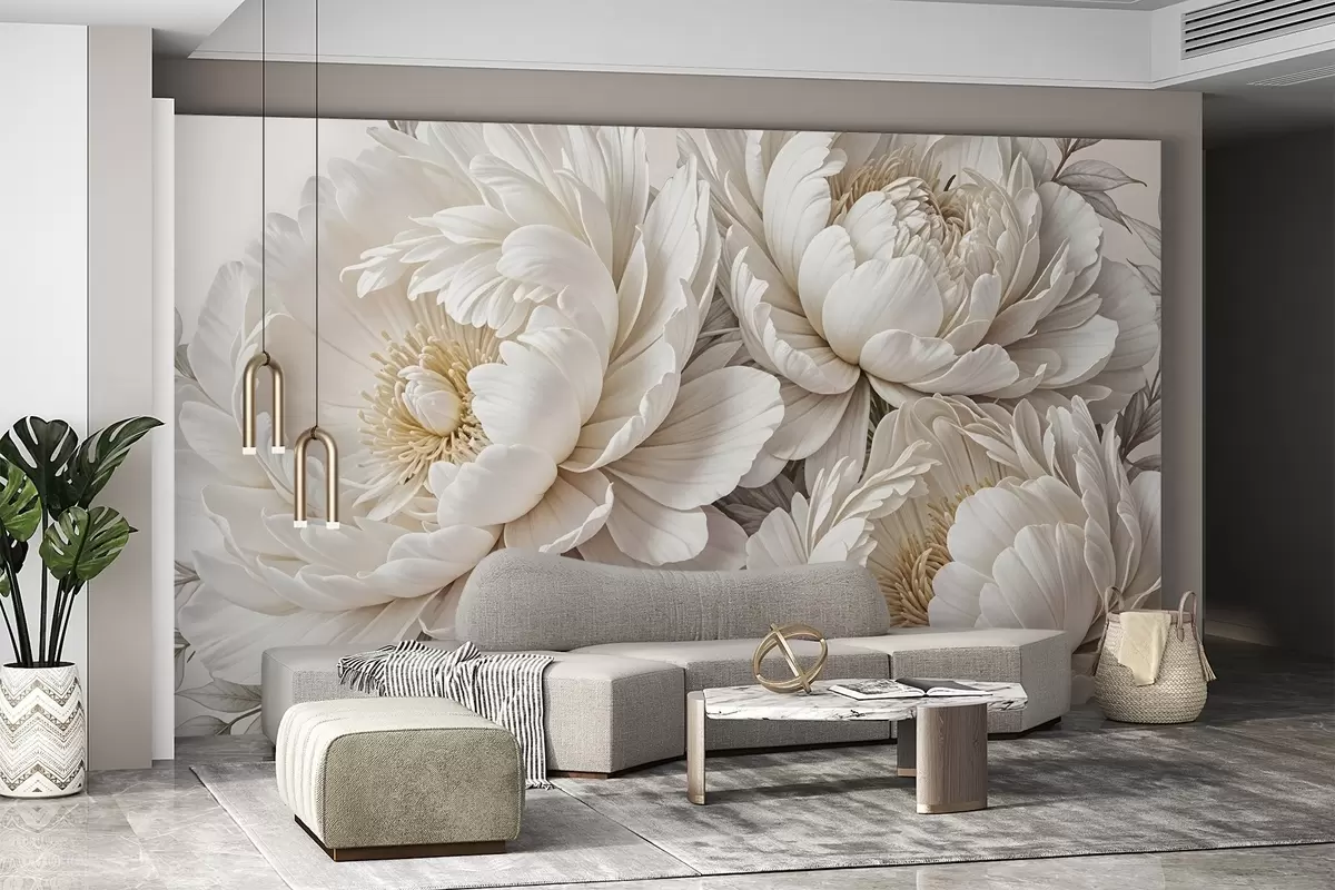 Fototapetak Finom pasztellfehér bazsarózsák buja lombokkal, lágy, semleges háttér előtt Nr. w08420