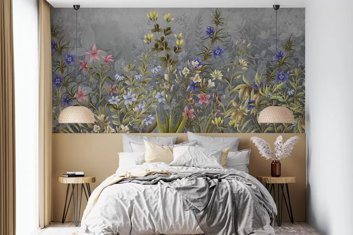 Fototapetak Egy buja, élénk virágos texturális nyomtatás színes virágokkal és növényekkel, bonyolult részletekkel és textúrákkal Nr. w08428v1