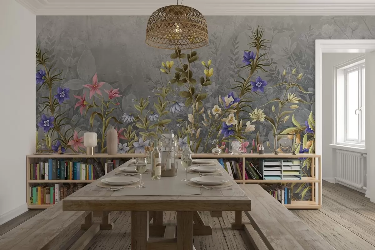 Fototapetak Egy buja, élénk virágos texturális nyomtatás színes virágokkal és növényekkel, bonyolult részletekkel és textúrákkal Nr. w08428v1