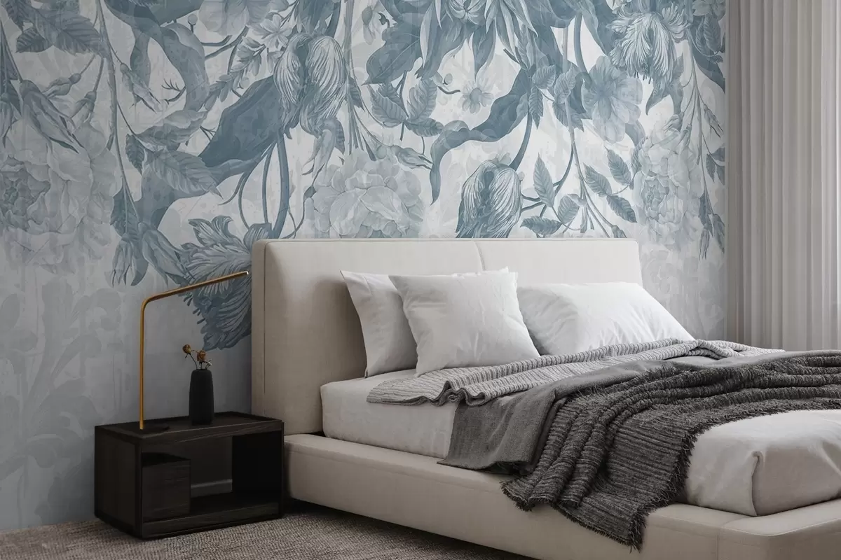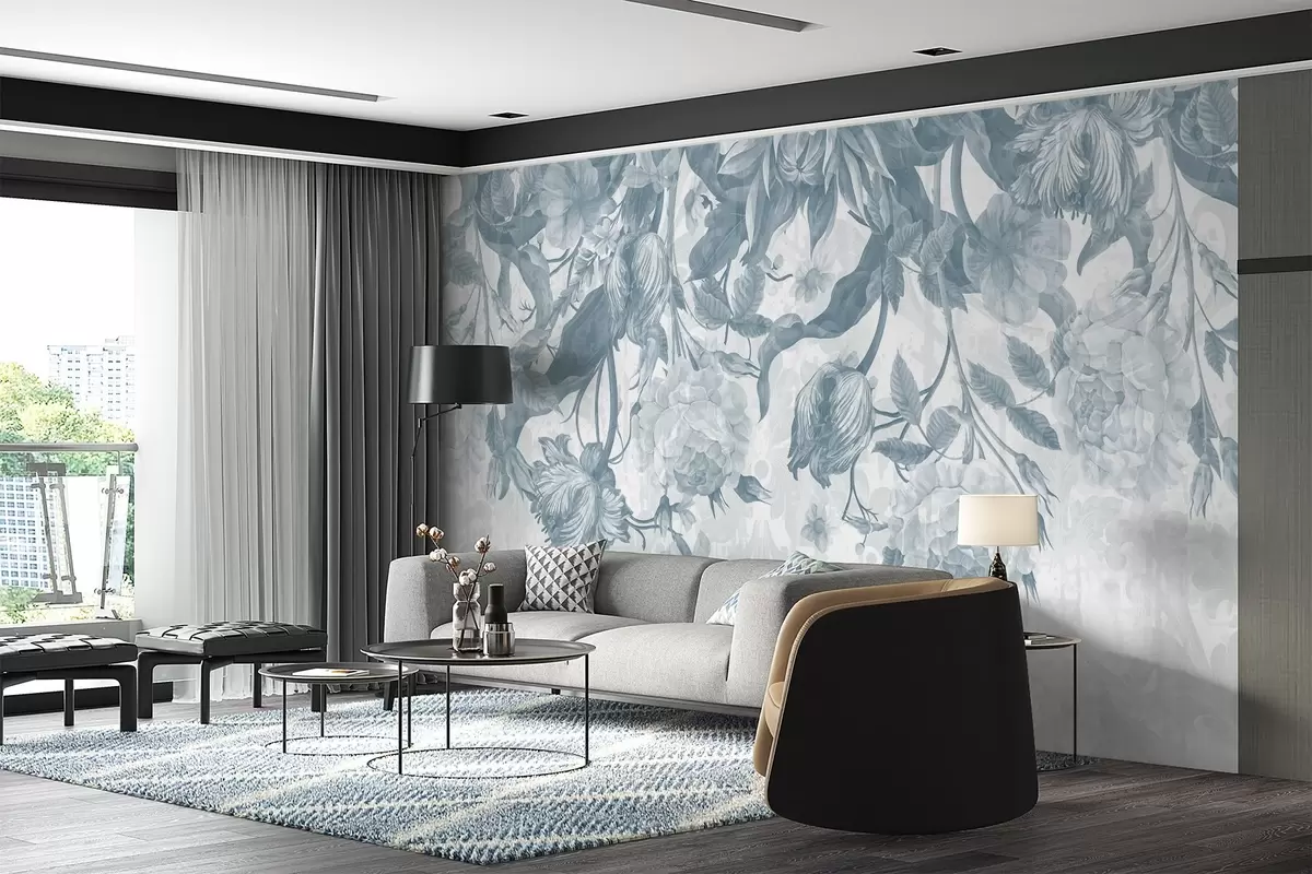 Fototapetak Egy buja virágkompozíció, nagy kék és fehér virágokkal, pasztellkék levelekkel és szárakkal Nr. w08435v1