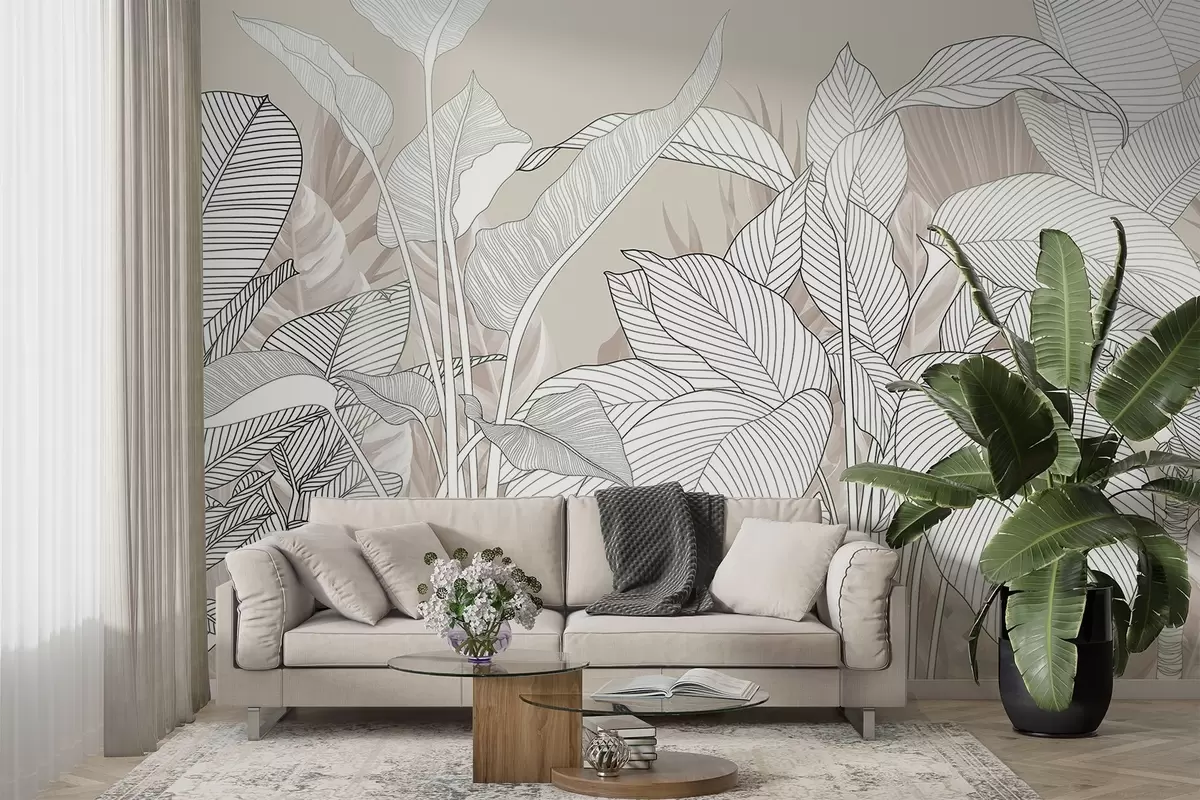 Fototapetak Monokróm illusztráció nagyméretű, stilizált levelekkel és lombokkal, bonyolult vonalmintákkal és textúrákkal Nr. w08436v1
