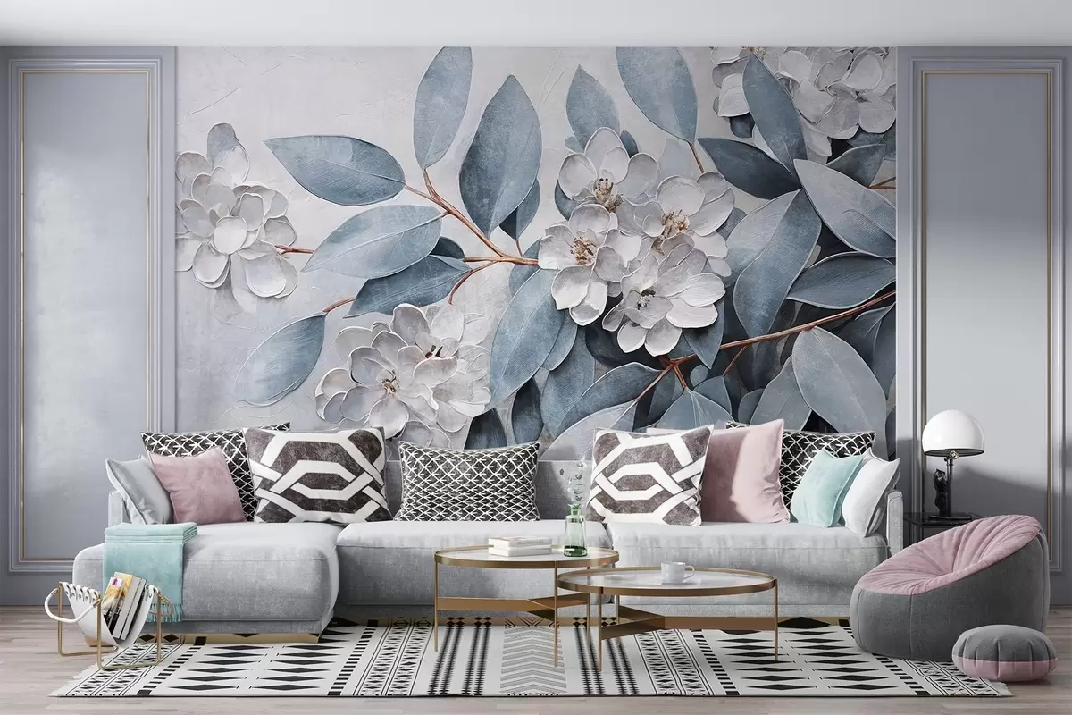 Fototapetak Finom fehér virágok szürkészöld levelekkel, lágy, tompa háttér előtt, olajfestmény stílusban Nr. w08437
