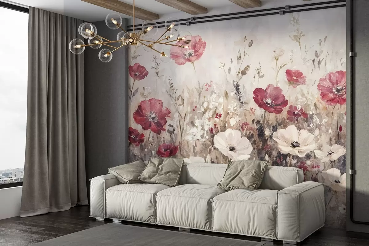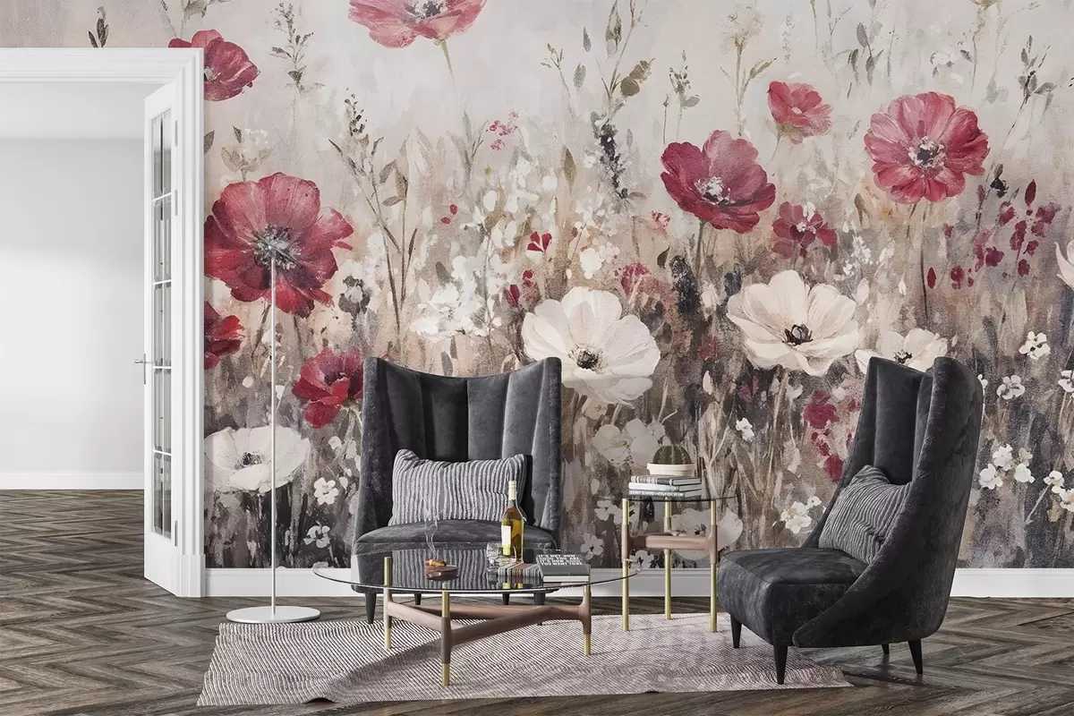 Fototapetak Élénk piros és fehér virágok mezője lágy, ködös háttér előtt, olajfestmény stílusban Nr. w08438