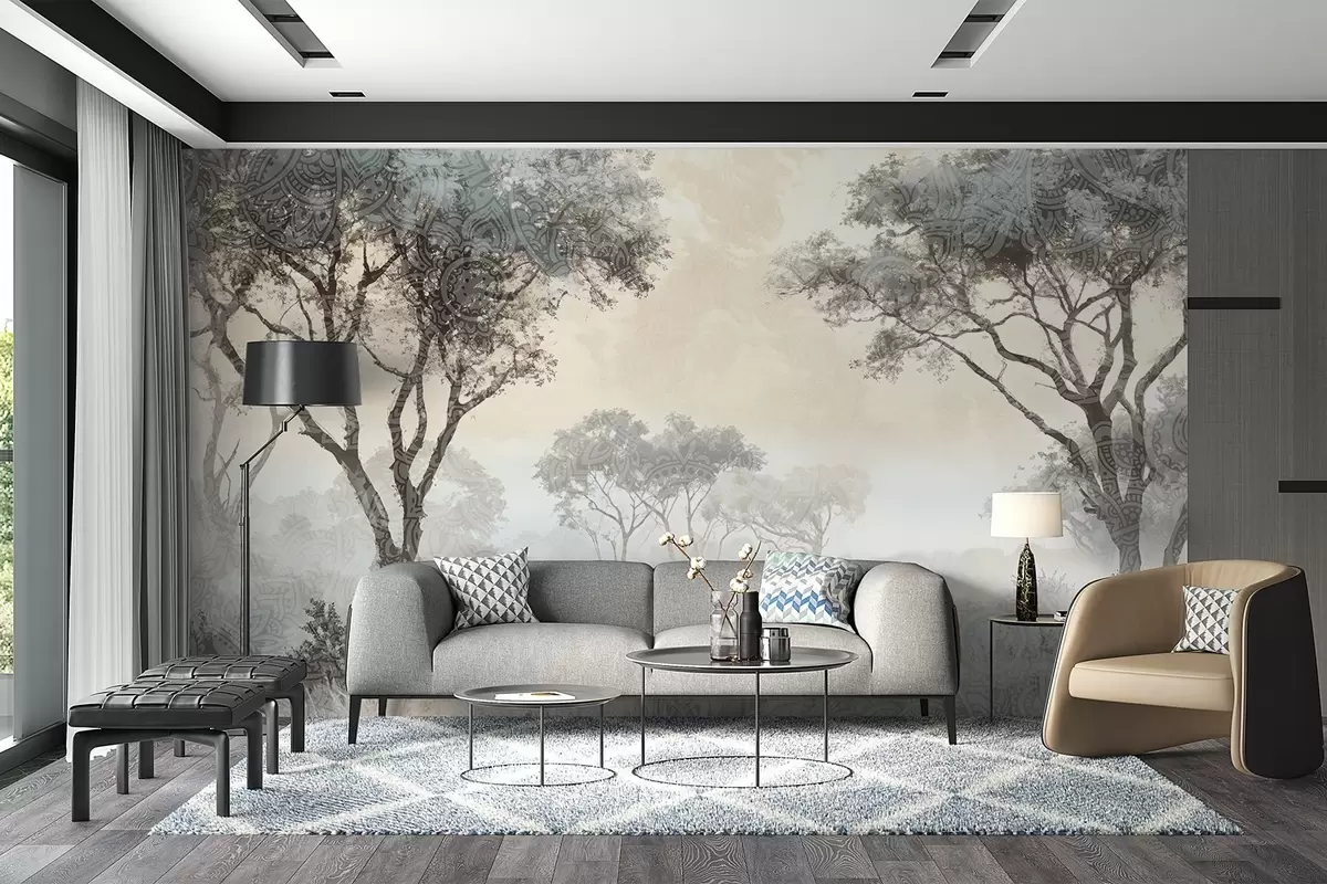 Fototapetak Ködös, nyugodt táj, sziluett fákkal az előtérben, lágy köddel a szürke és a bézs árnyalataiban Nr. w08442v1
