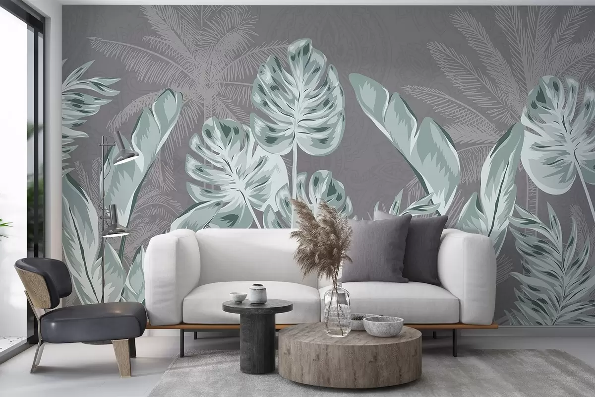 Fototapetak Nagy, finom teal levelek egy tompa szürke háttér előtt , ami nyugodt és éteri hangulatot teremt Nr. w08449v1