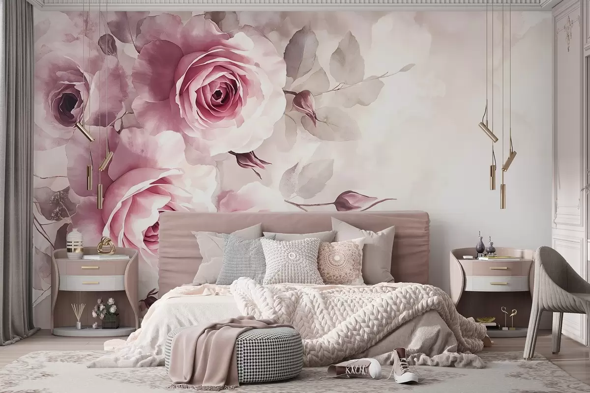 Fototapetak Finom pasztell rózsaszín rózsák és levelek lágy, elmosódott akvarell utánzat háttérrel Nr. w08459