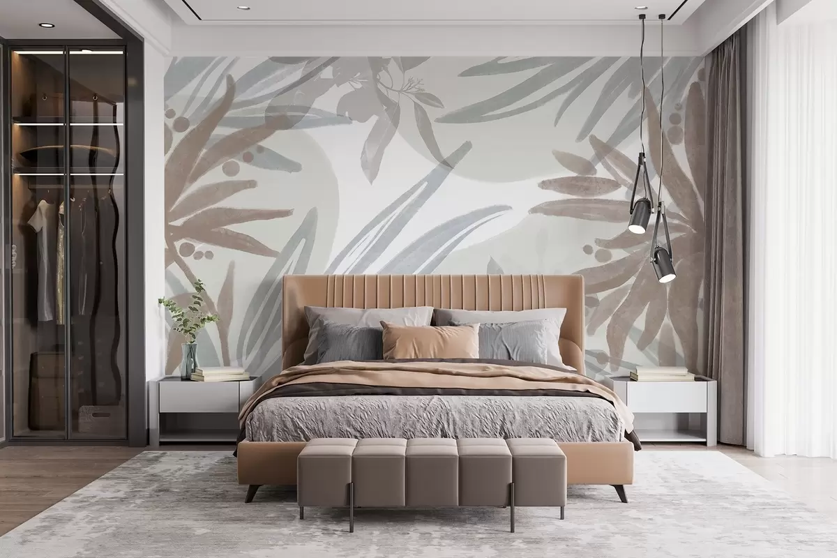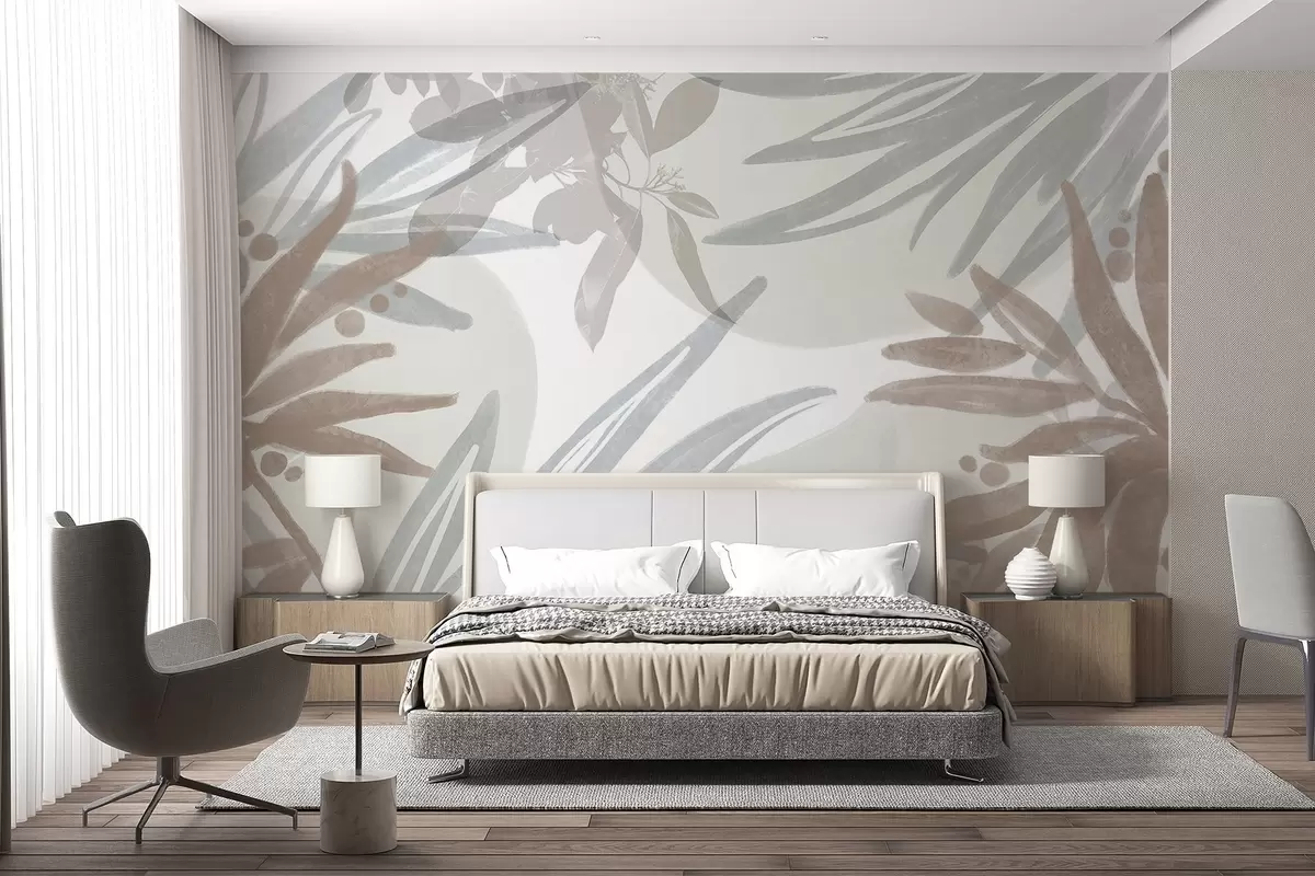 Fototapetak Semleges tónusú absztrakt virágmintás, egymást átfedő levelekkel és formákkal a szürke , fehér és bézs árnyalataiban Nr. w08464