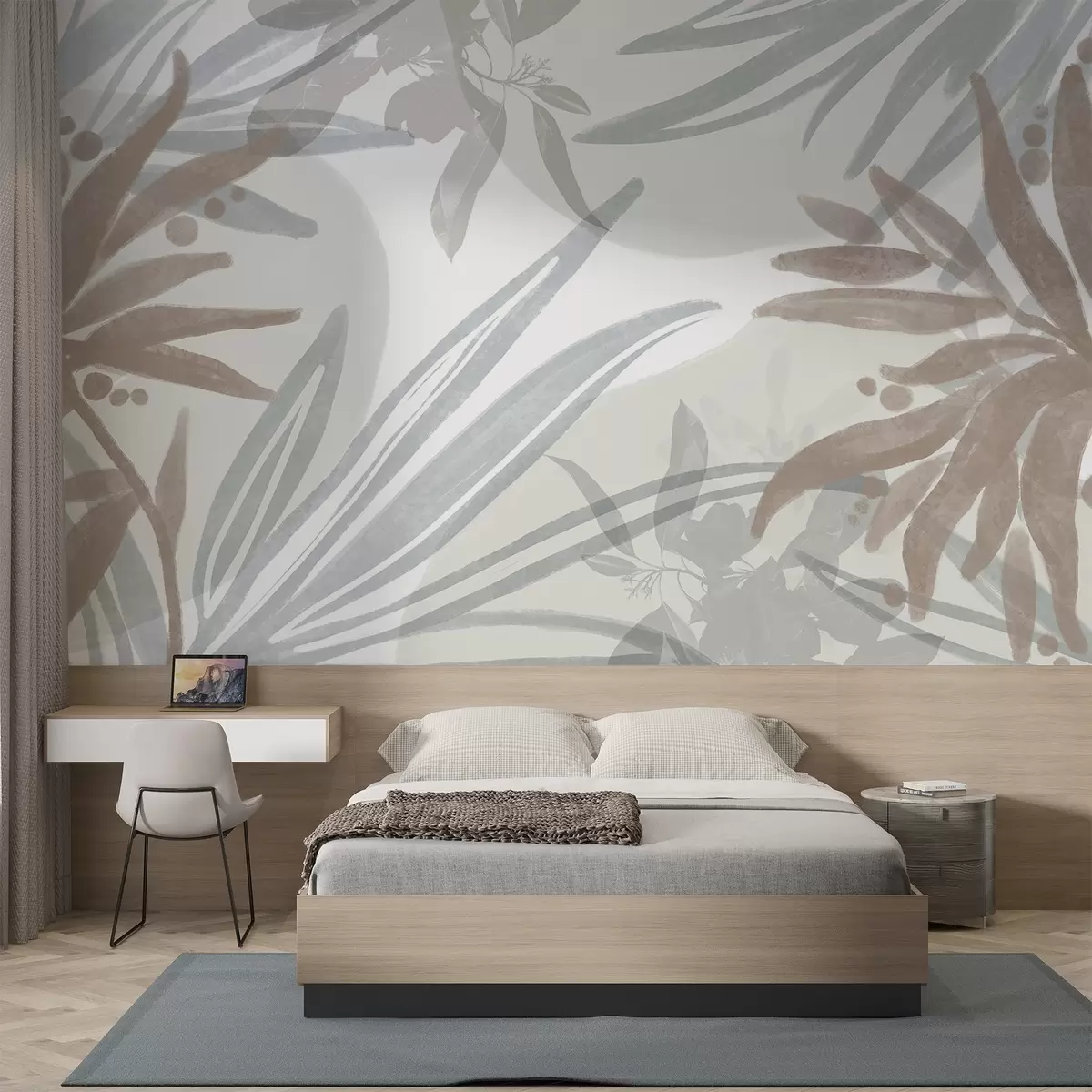 Fototapetak Semleges tónusú absztrakt virágmintás, egymást átfedő levelekkel és formákkal a szürke , fehér és bézs árnyalataiban Nr. w08464