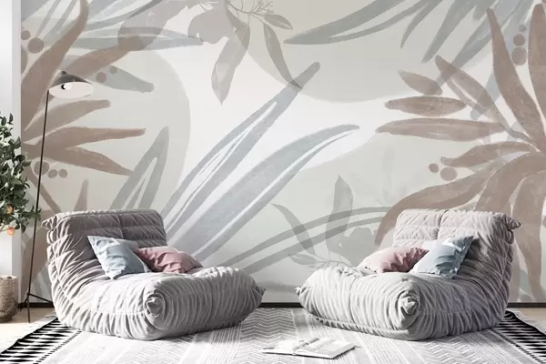 Fototapetak Semleges tónusú absztrakt virágmintás, egymást átfedő levelekkel és formákkal a szürke , fehér és bézs árnyalataiban Nr. w08464