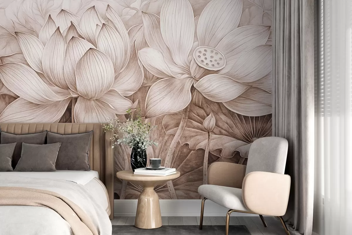Fototapetak Több részletes textúrájú nagy bézs lótuszvirág barna levelekkel és szárakkal világos háttér előtt Nr. w08465v1