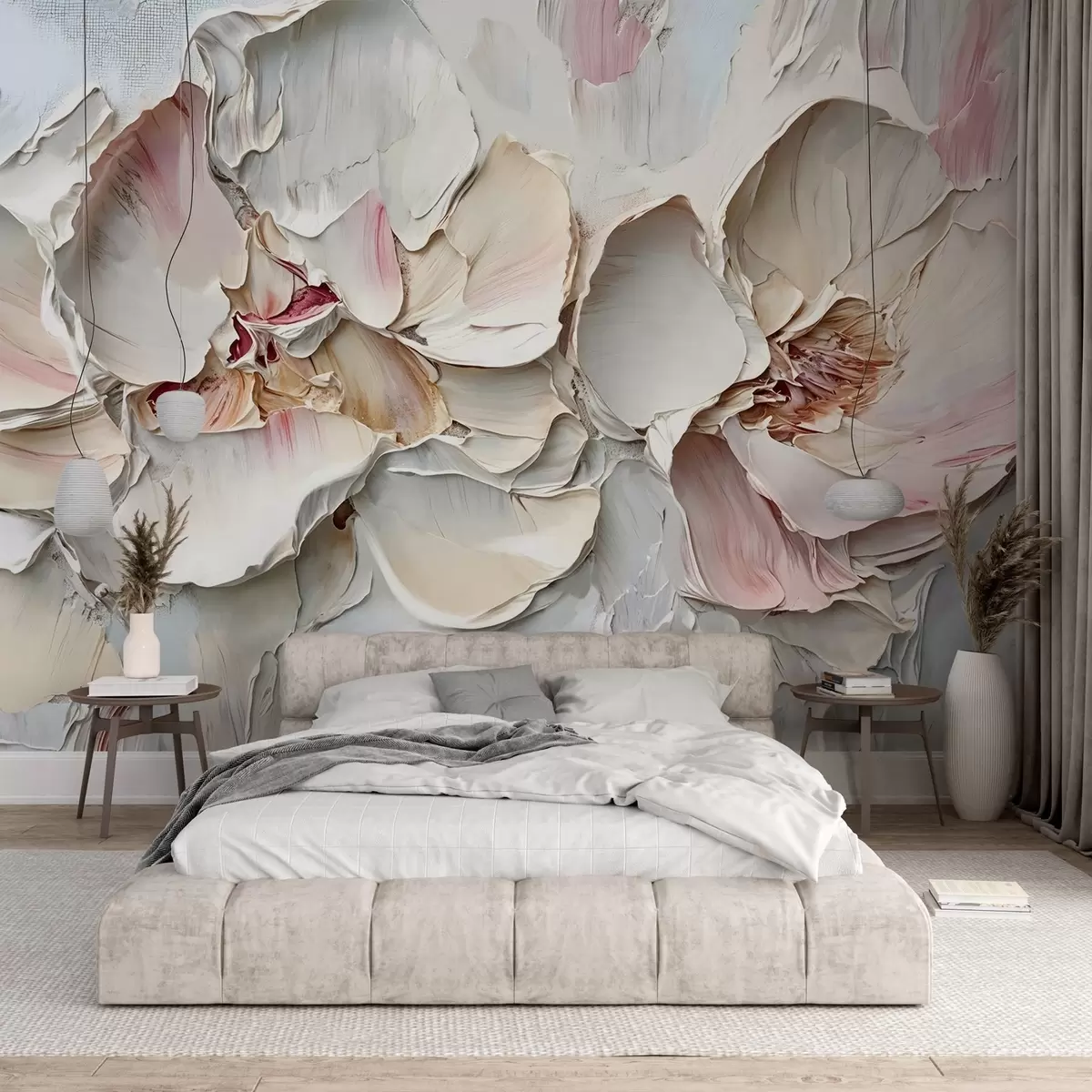 Fototapetak Finom, halvány rózsaszín virágok lágy, rétegzett szirmokkal, tompa, textúrázott háttéren, impasto olajfestmény utánzat Nr. w08467