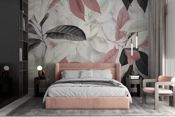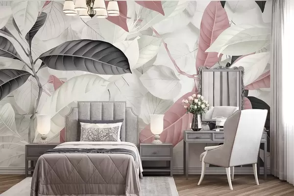 Fototapetak Rózsaszín és szürke levelek nagyméretű nyomtatása a világos levelek textúrájú hátterén, ami buja trópusi hangulatot teremt Nr. w08468