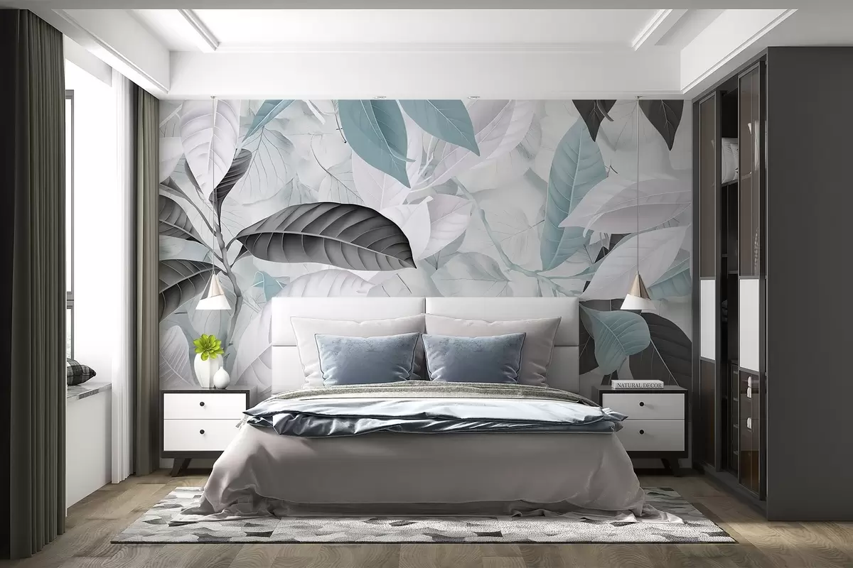 Fototapetak Kék és szürke levelek nagyméretű nyomtatása világos levelek textúrájú hátterén, ami buja trópusi hangulatot teremt Nr. w08468v1