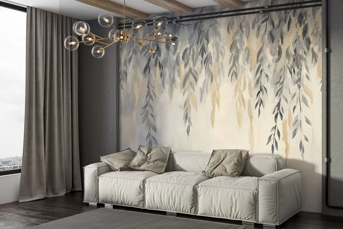 Fototapetak Fűzfa ágak finom levelekkel lógnak lefelé egy lágy, elmosódott textúrájú háttér előtt Nr. w08473