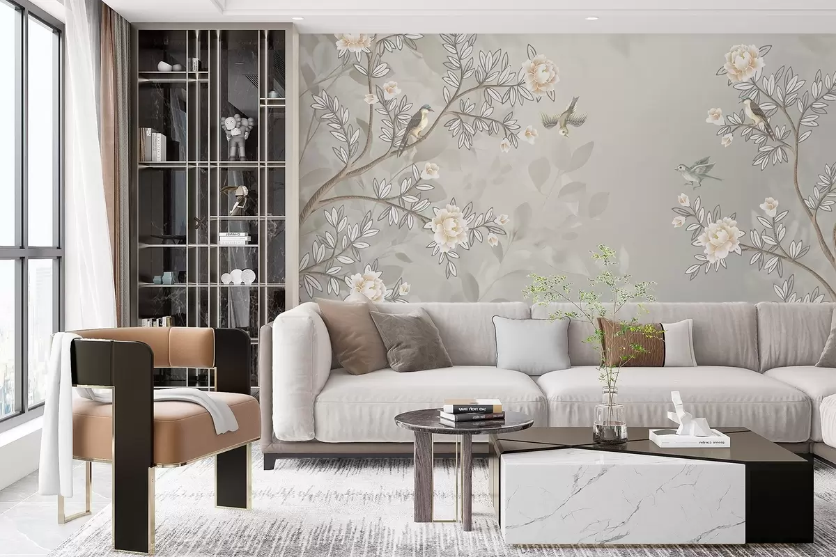 Fototapetak Ágak rózsákkal és repülő madarakkal világos tónusokban Nr. w08493