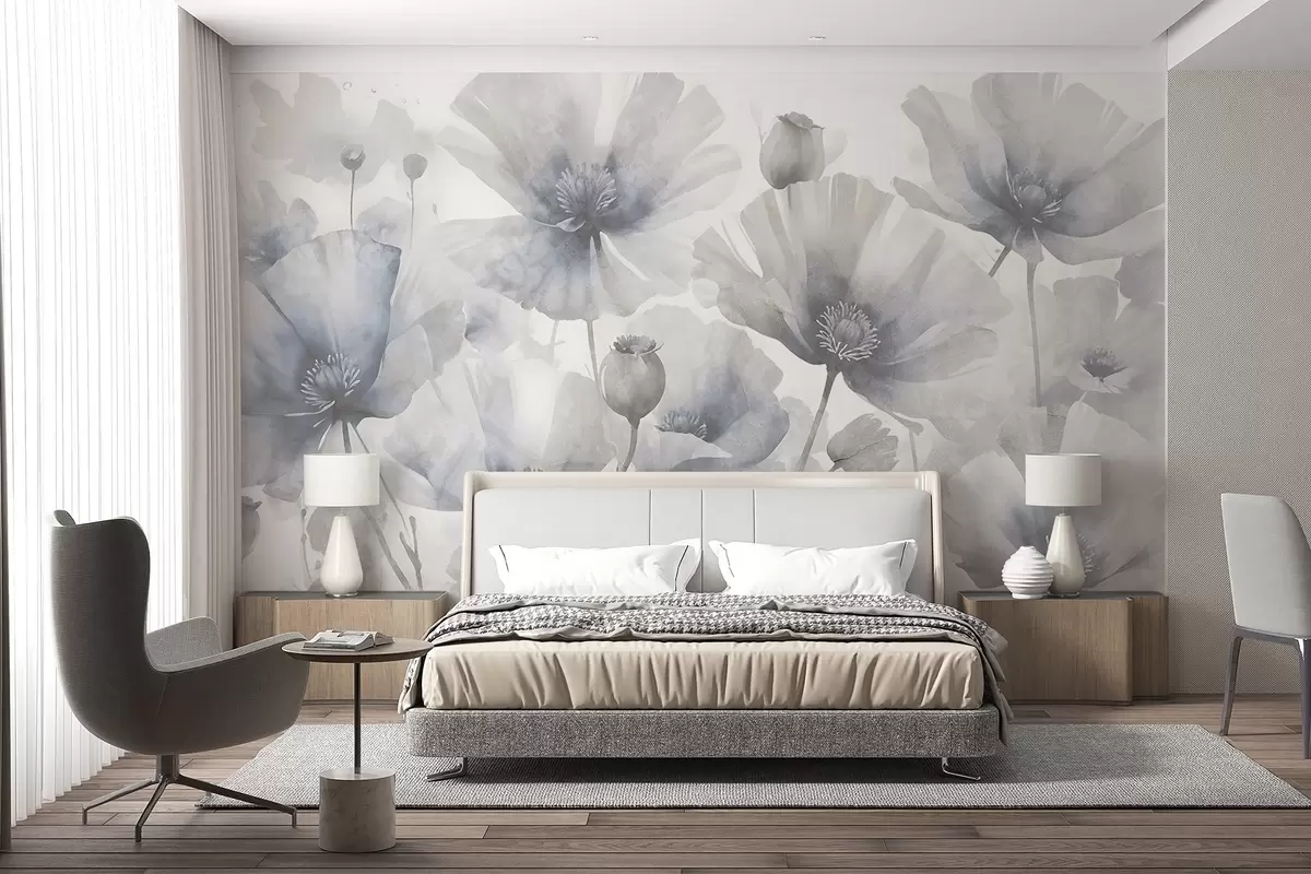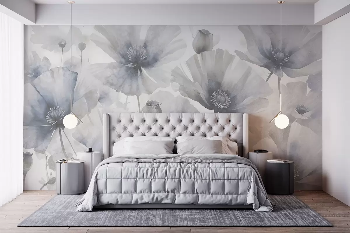 Fototapetak Finom texturális grunge szürke és fehér virágok lágy, elmosódott szirmokkal fehér háttér előtt Nr. w08526