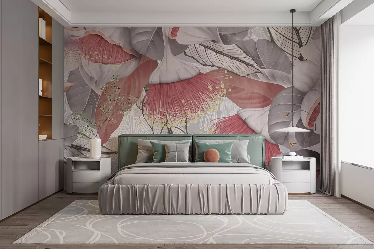 Fototapetak Botanikai illusztráció nagy, eukaliptusz virágok hosszú porzóval szürke és fehér háttér előtt Nr. w08539
