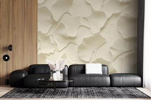 Fototapetak Stukkó, finom ginkgo levelek dombornyomásával, lágy bézs háttéren Nr. w08560