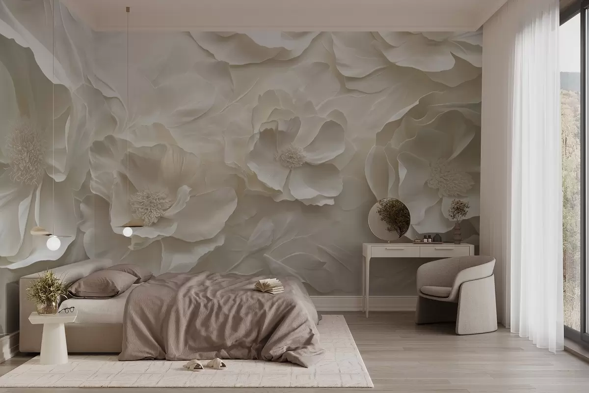 Fototapetak Légies virágok meleg tónusokban, levélvonások hátterében Nr. w08562