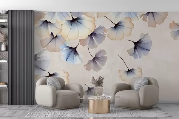 Fototapetak Pasztell színű kék és bézs ginkgo levelek finom szirmokkal lebegnek a levegőben egy texturális háttér előtt Nr. w08578