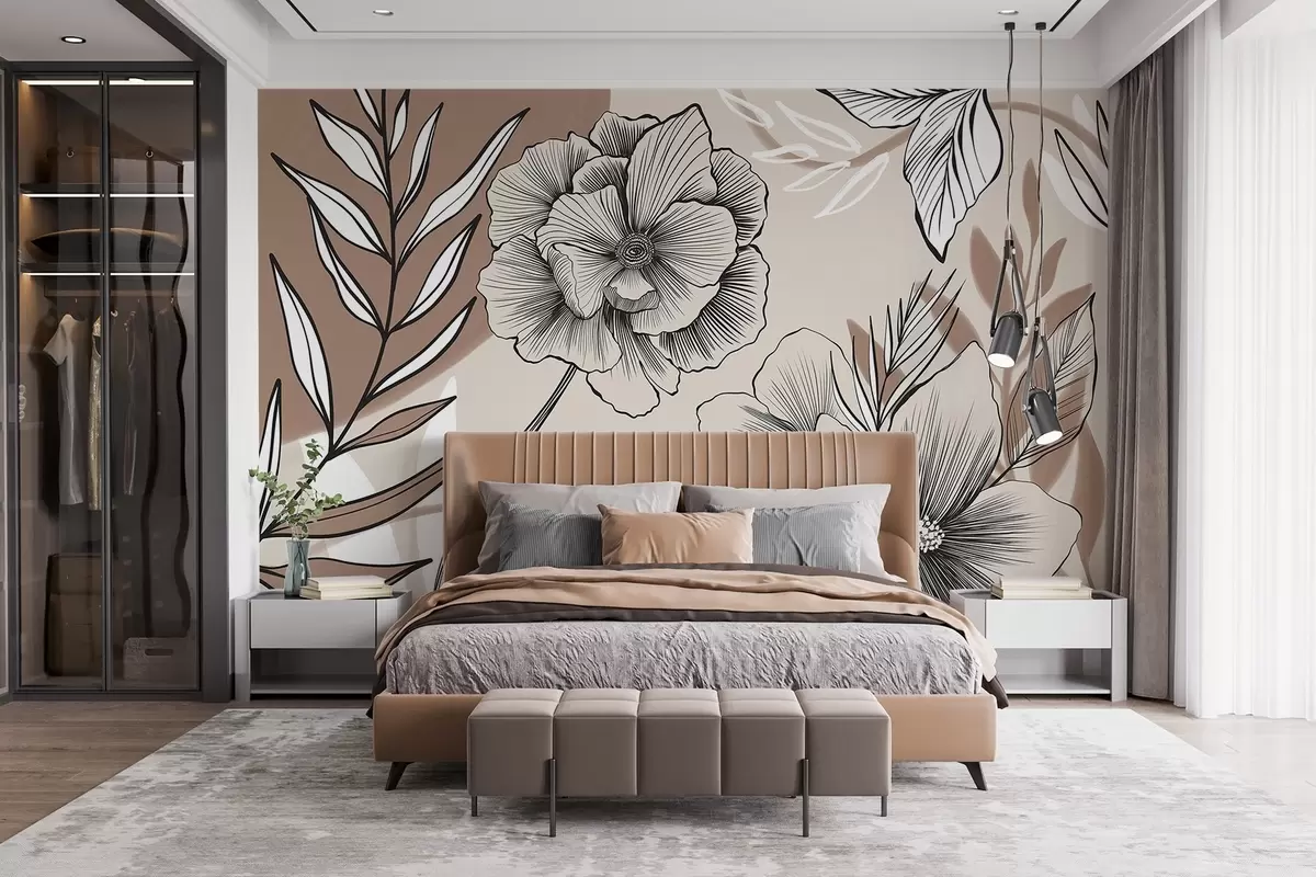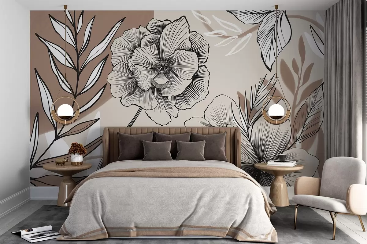 Fototapetak Nagy fekete-fehér grafikus virágok részletes levelekkel bézs absztrakt háttéren Nr. w08580