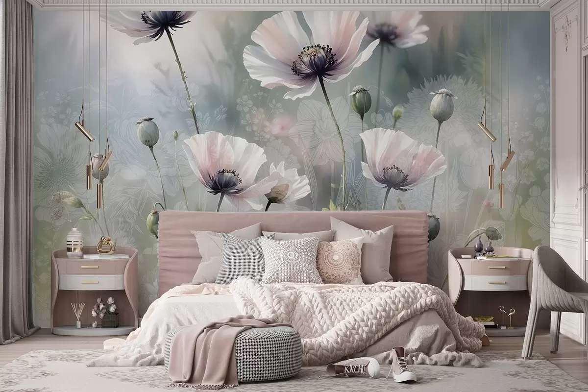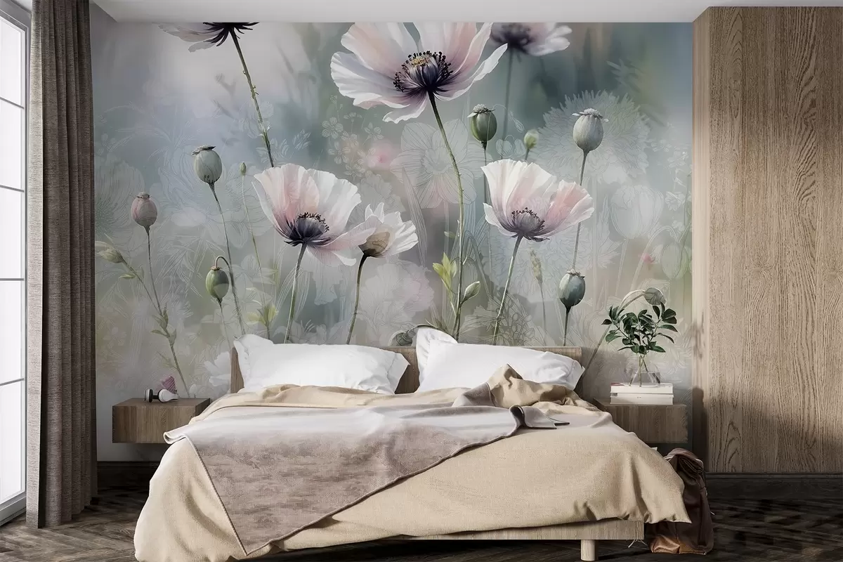 Fototapetak Finom rózsaszín és lila pipacsok zöld szárakkal és bimbókkal egy lágy, elmosódott textúrájú háttér előtt Nr. w08585