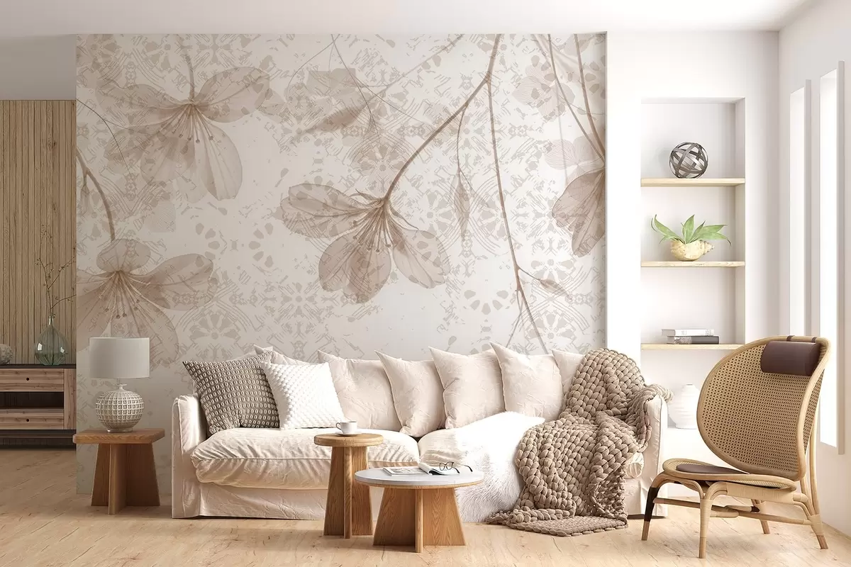 Fototapetak Finom bézs és fehér virágok hosszú szárral és szirmokkal, lágy, elmosódott textúrájú háttér előtt Nr. w08588v1