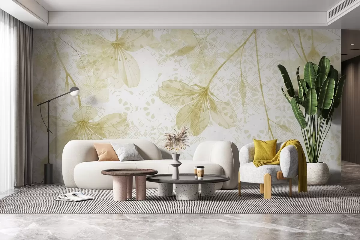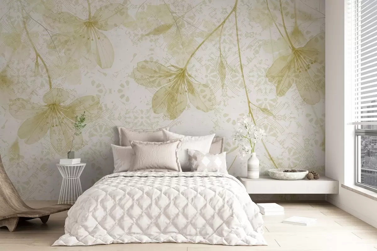 Fototapetak Finom sárga és fehér virágok hosszú szárral és szirmokkal, lágy, elmosódott textúrájú háttér előtt Nr. w08588v2