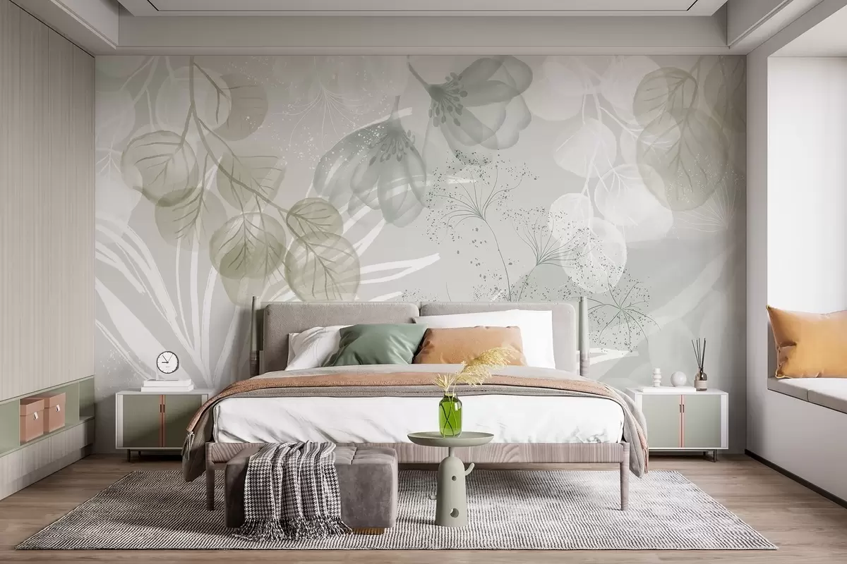 Fototapetak Virágos eukaliptusz elemek zöld és fehér árnyalatokban, egymást átfedő levelekkel és szirmokkal, minimalista stílusban Nr. w08599v1