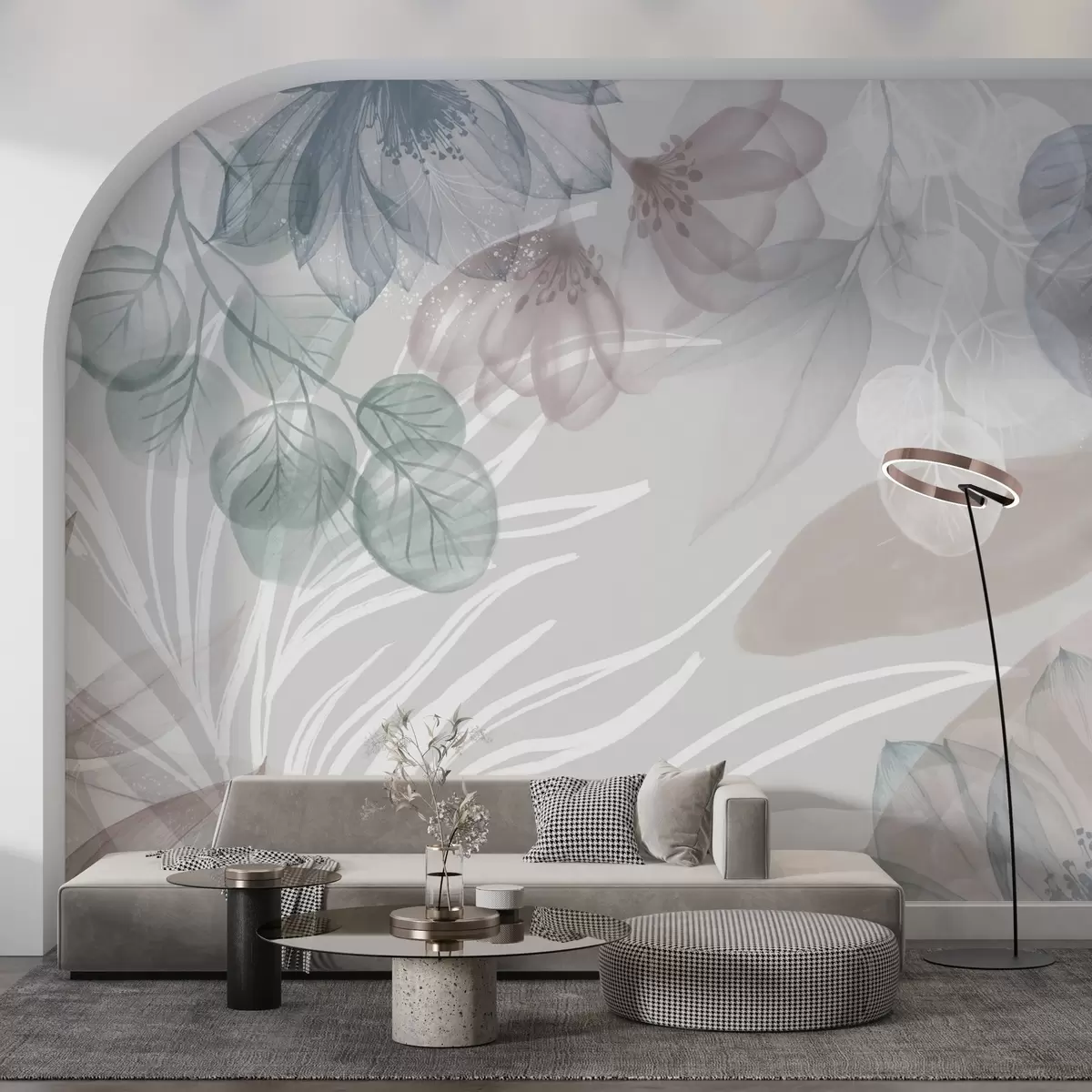 Fototapetak Pasztellszínű virágmintás nyomtatás átlátszó nagy absztrakt virágokkal és levelekkel a szürke, rózsaszín és zöld árnyalataiban Nr. w08600