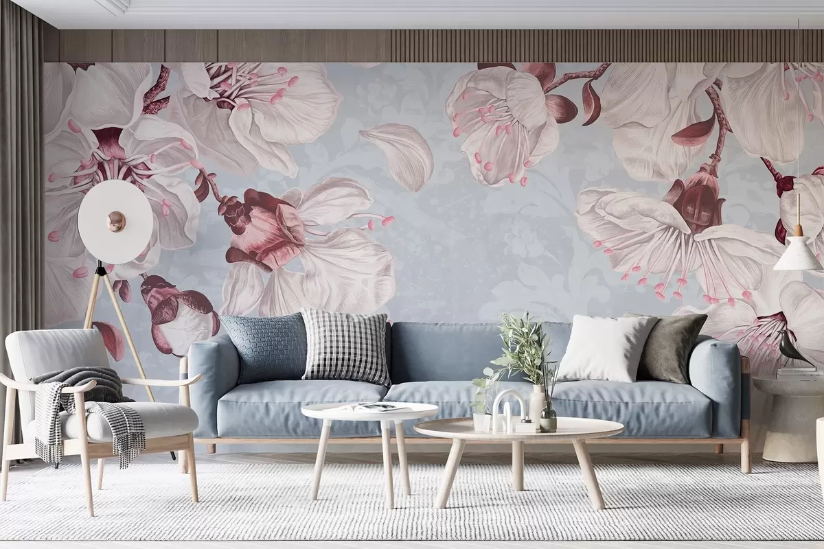 Fototapetak Virágos nyomtatás nagy rózsaszín és fehér cseresznye virágzó virágokkal világoskék texturális háttér előtt Nr. w08601