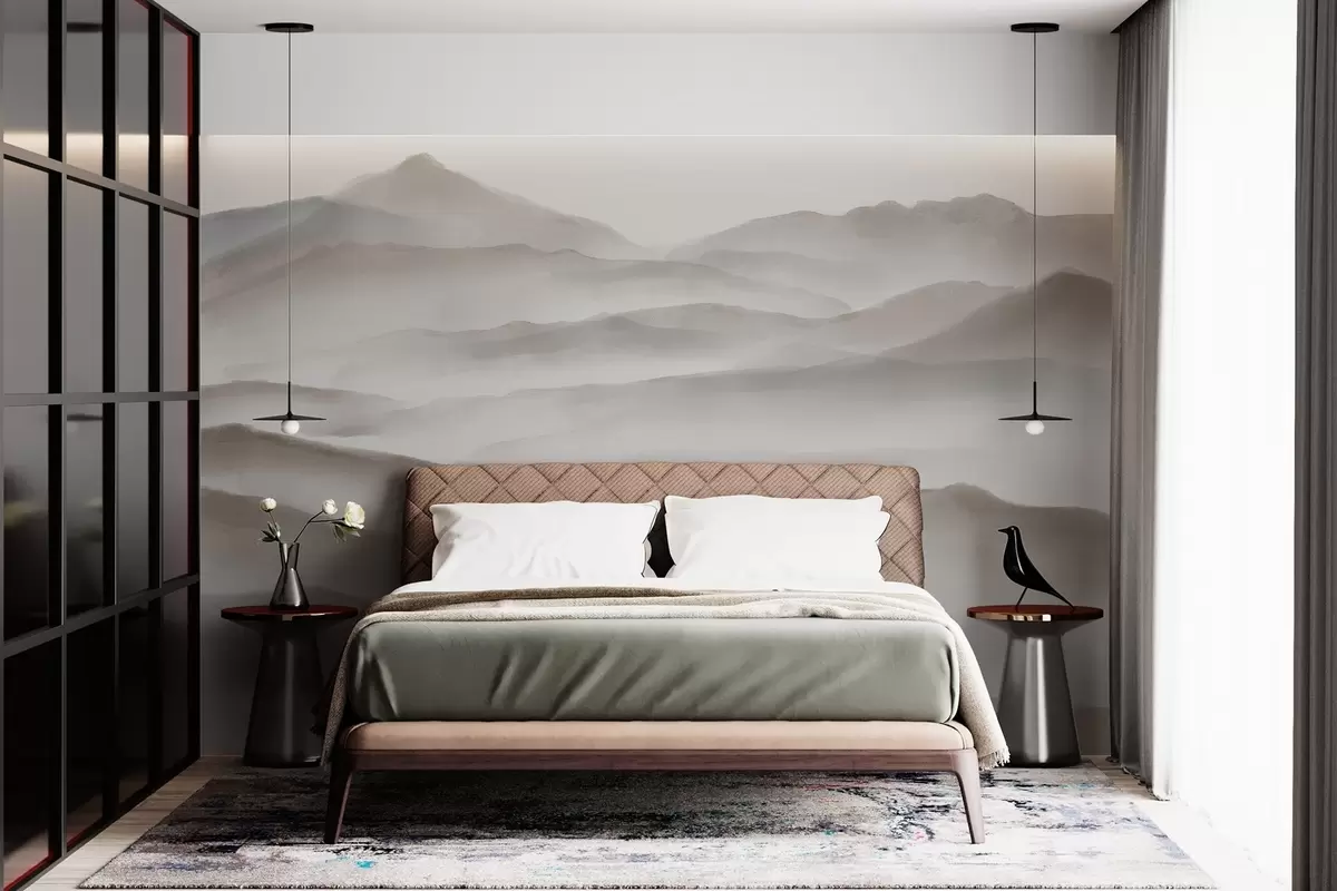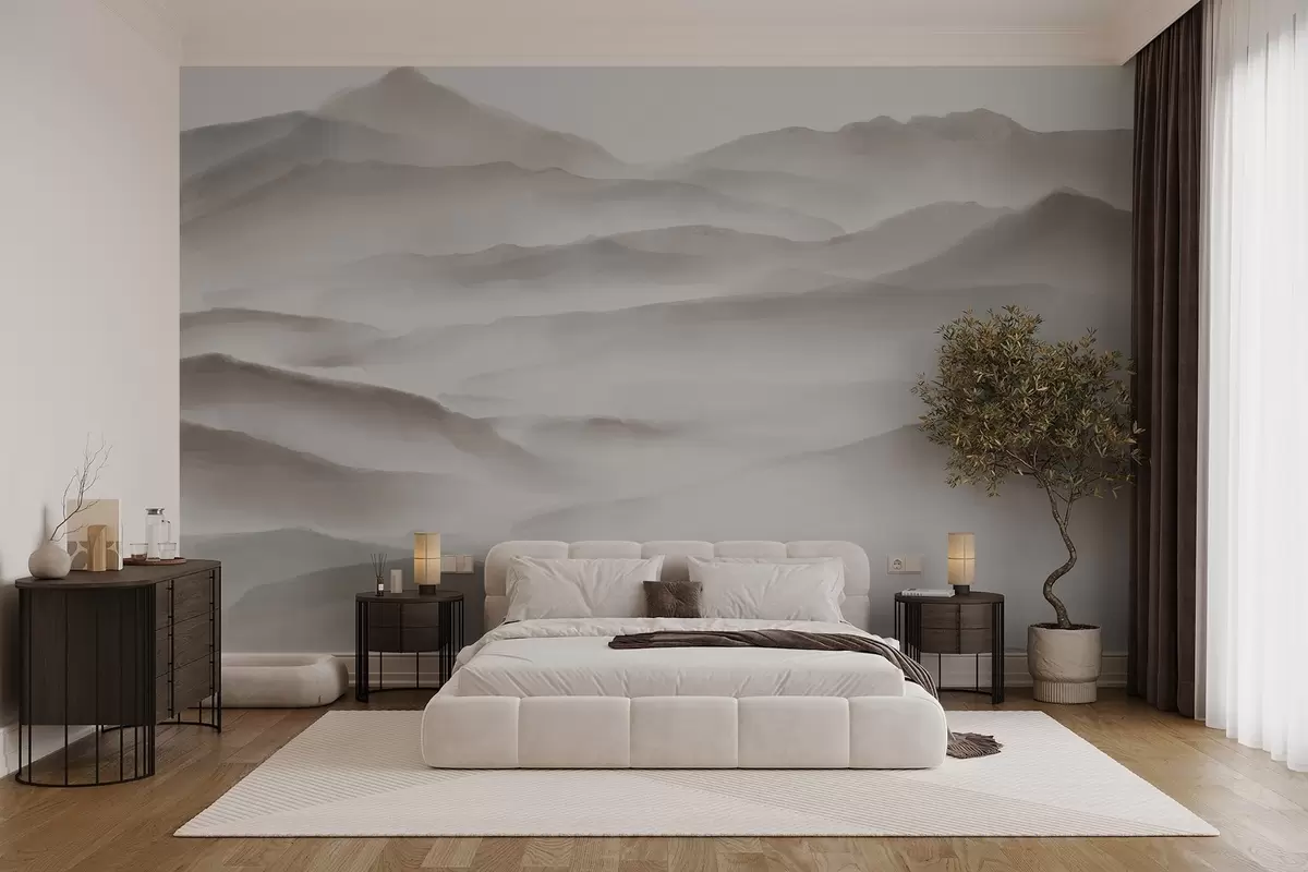 Fototapetak Minimalista hegyi táj, dombokkal és köddel , ami egy nyugodt és hangulatos nyomatot hoz létre Nr. w08602