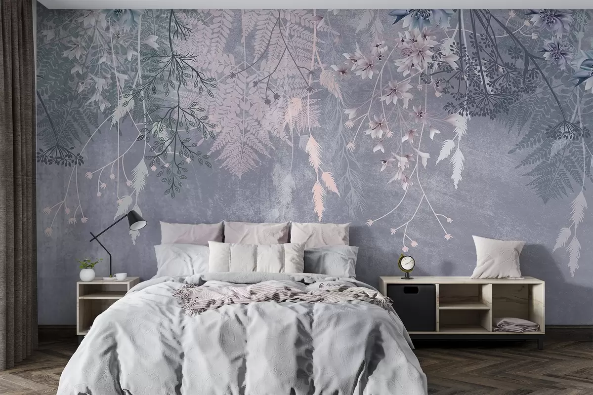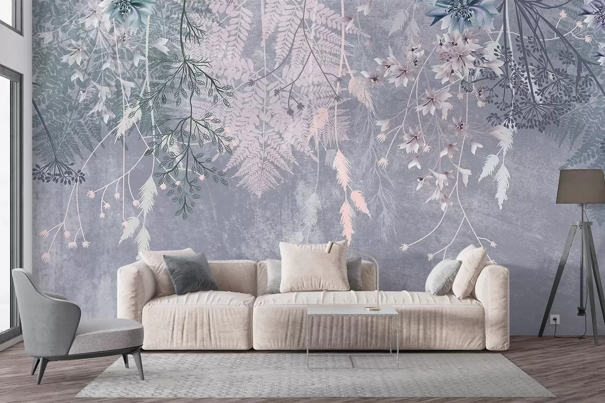Fototapetak Álomszép, finom, foszlós növények, tüskék és virágok kék pasztell színekben, ködös, texturált háttér előtt Nr. w08606