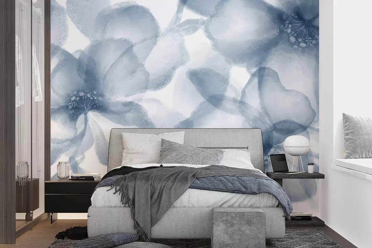 Fototapetak Lágy, elmosódott absztrakt kék virágok, amelyek egy nyugodt és megnyugtató virágmintát hoznak létre Nr. w08607