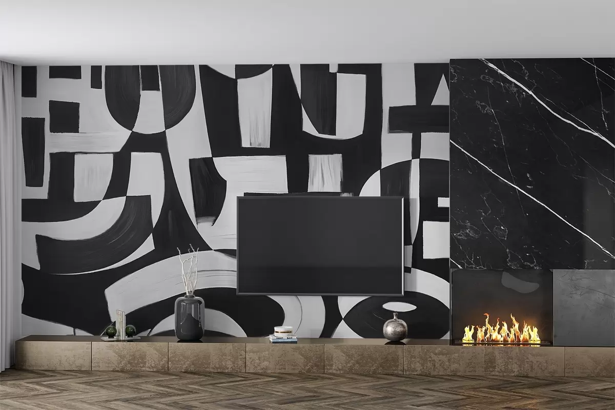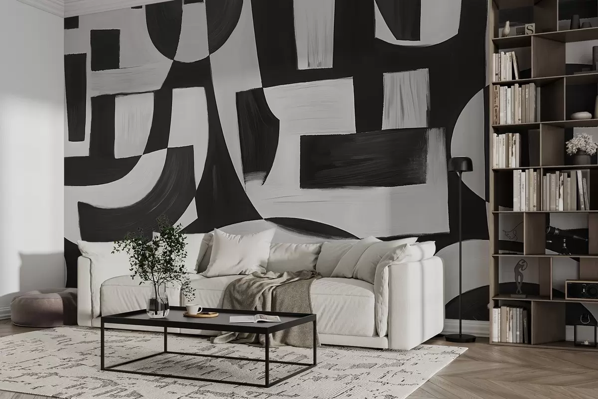 Fototapetak Absztrakt fekete-fehér geometriai formák és minták, amelyek vizuálisan feltűnő és dinamikus kompozíciót alkotnak Nr. w08608