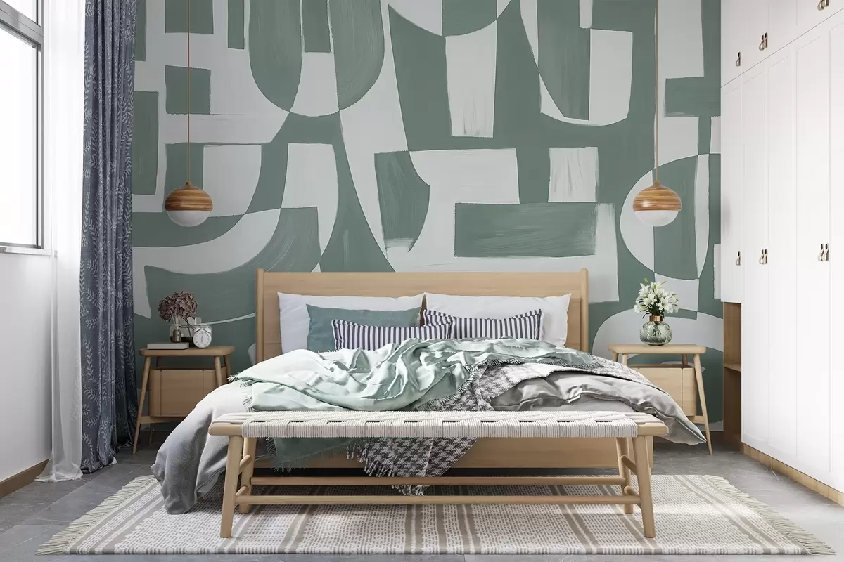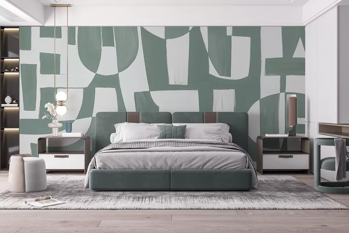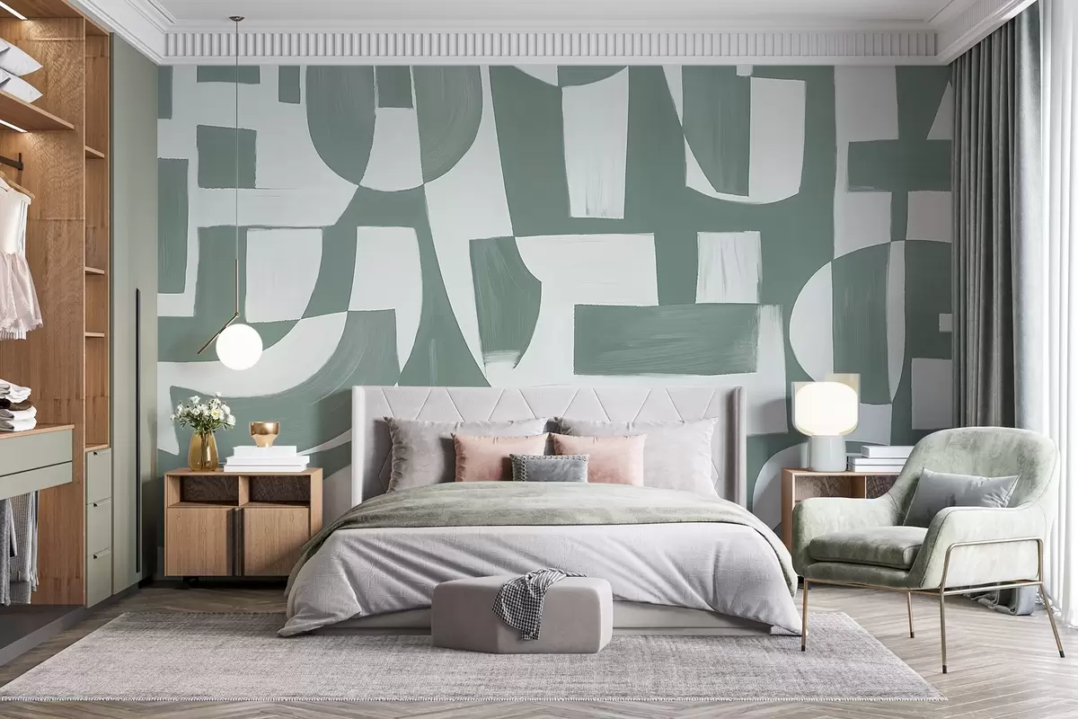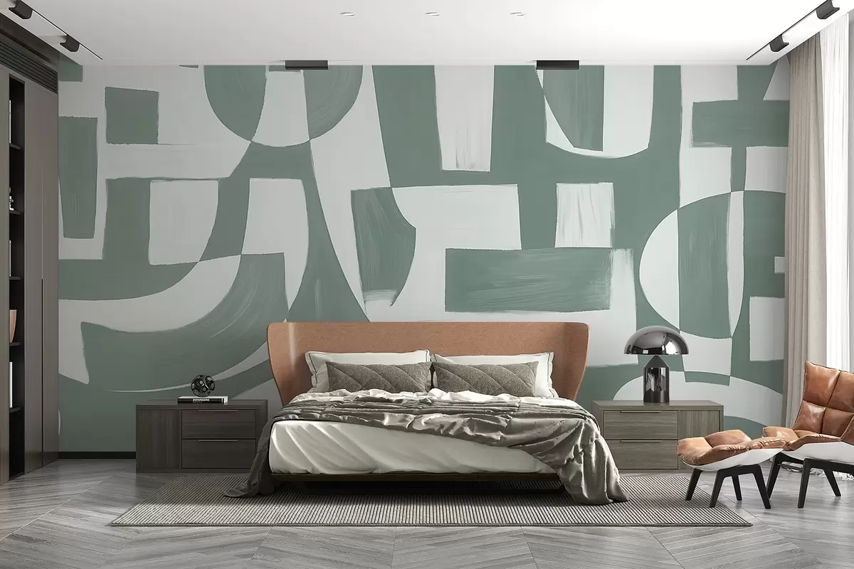 Fototapetak Absztrakt zöld és fehér geometriai formák és minták, amelyek vizuálisan feltűnő és dinamikus kompozíciót alkotnak Nr. w08608v1