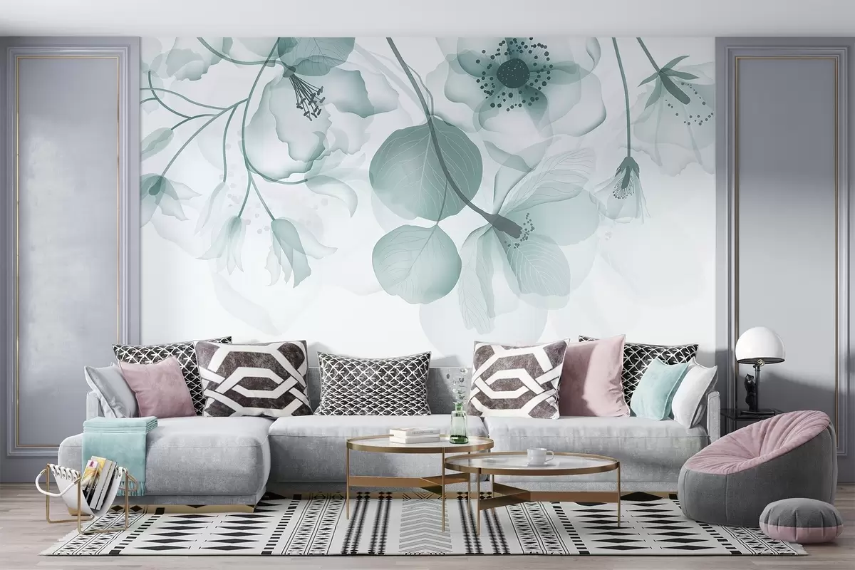 Fototapetak Finom, visszafogott türkizkék áttetsző virágok lágy szirmokkal és sötét középponttal, világos háttér előtt Nr. w08613v1