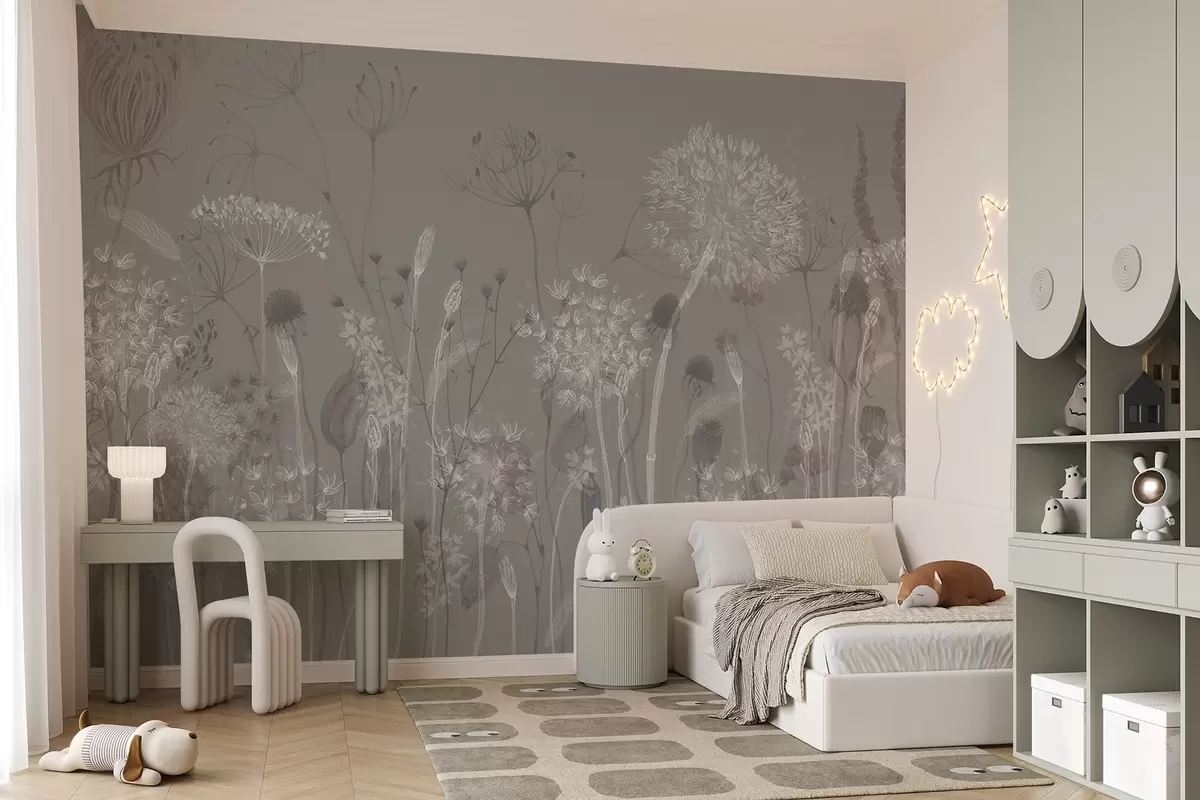 Fototapetak Légies pitypang és vadvirágok akvarell stílusban, kék-szürke árnyalatokban Nr. w08637v3
