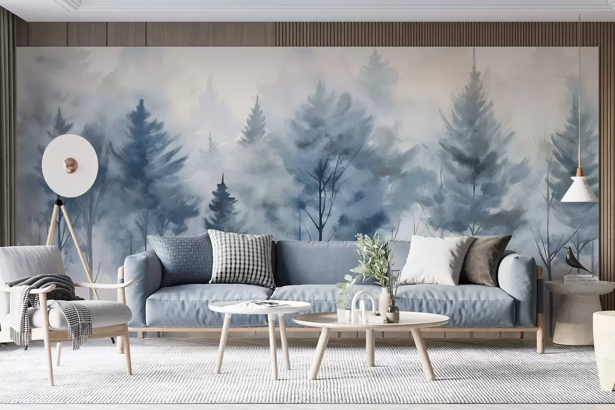 Fototapetak Ködös erdei táj magas fenyőfákkal és csupasz lombhullató fák az előtérben akvarell utánzat művészet Nr. w08643