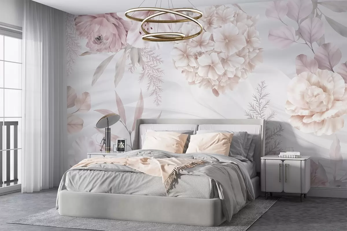 Fototapetak Lágy, absztrakt virágmintás, nagy rózsaszín és fehér virágokkal, finom levelekkel és visszafogott, pasztell színpalettával Nr. w08651