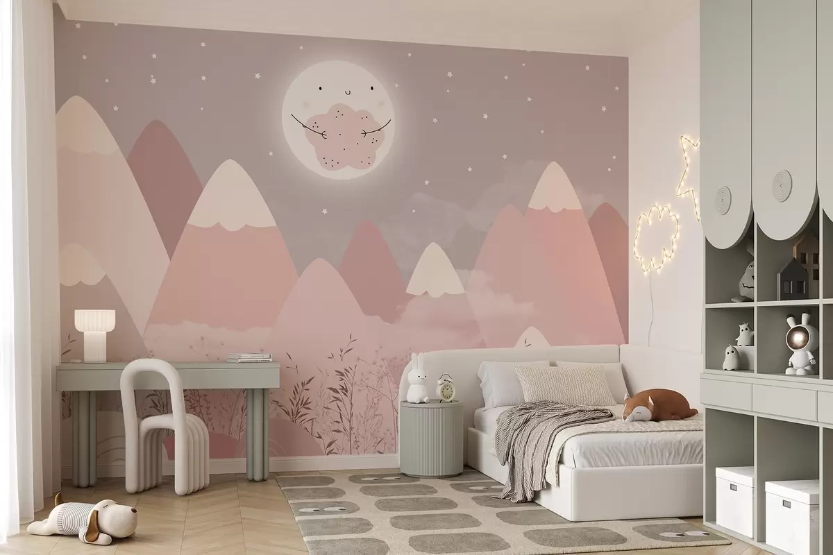 Fototapetak Gyermek hegyek aranyos holddal és növényekkel az alján Nr. w08659
