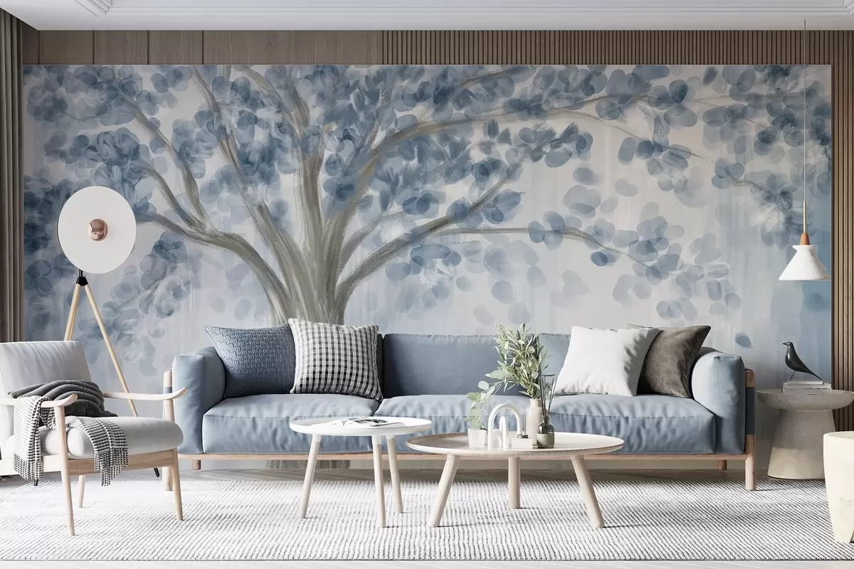 Fototapetak Egy nagy fa lágy, absztrakt kék levelekkel, világos, semleges háttérrel, amely kiemeli a fa tónusait Nr. w08669v1