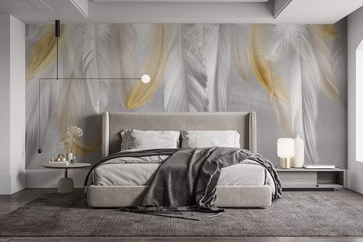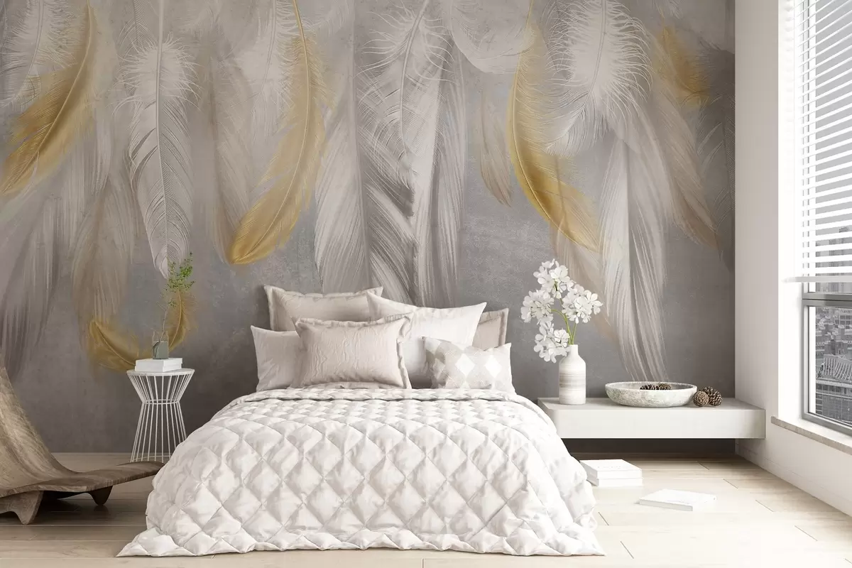 Fototapetak Fehér és sárga tollak lógnak egy lágy szürke háttér előtt, ami egy finom és légies kompozíciót hoz létre Nr. w08670
