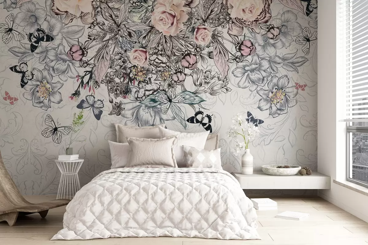 Fototapetak Virágos rajz rózsaszín rózsákkal és különböző virágokkal és pillangókkal, bonyolult vonalvezetéssel, texturált háttérrel Nr. w08674